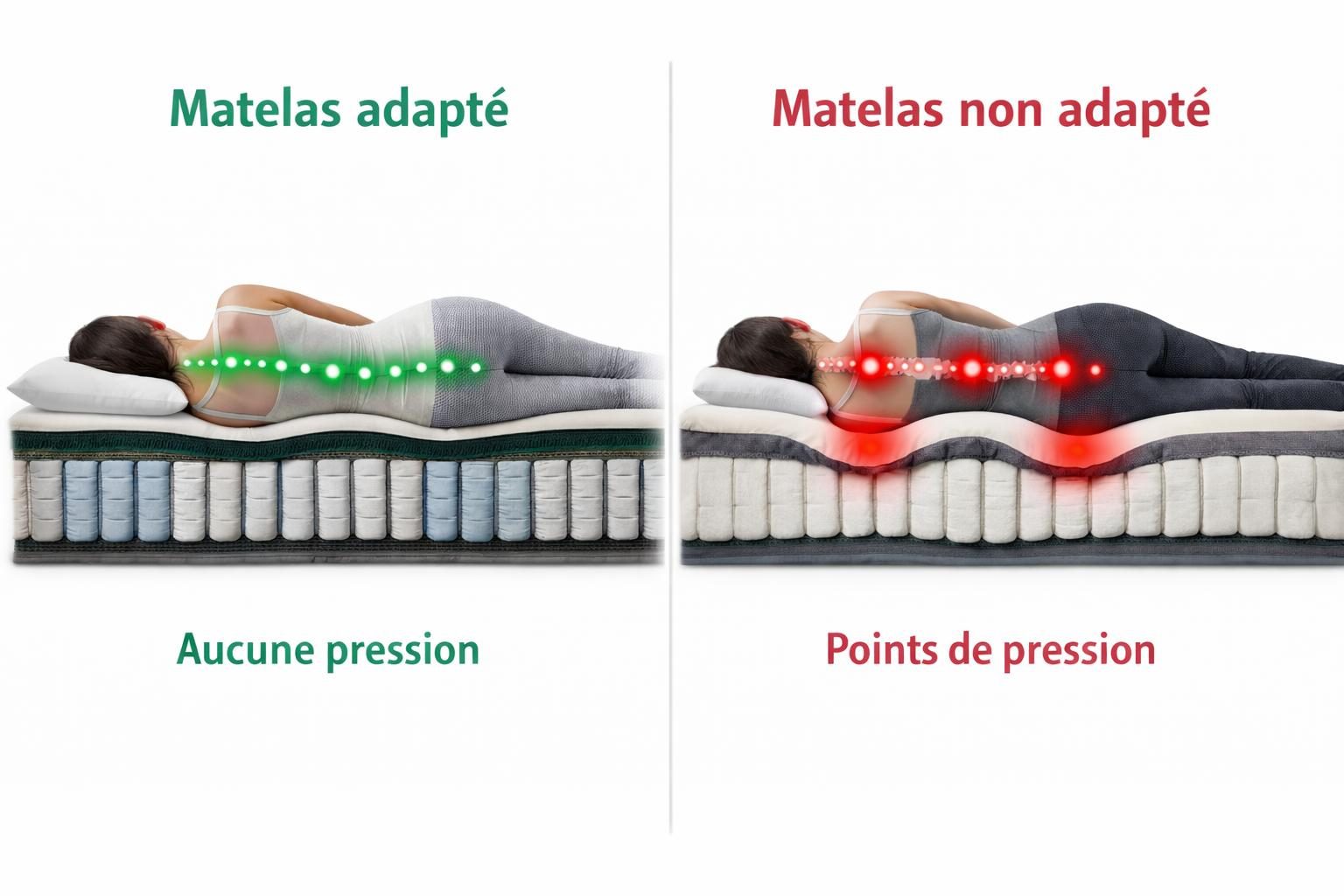 Pression du dos avec un matelas adapté à votre morphologie et matelas non adapté.